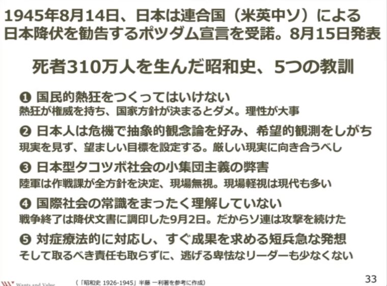 そして先の戦争でいかんなく発揮された日本人の悪いクセは、多くの日本人に正しく自覚されていないために、ほぼ放置されていて直っていません。これが現代日本で、様々な社会問題の根本的な温床になっており、様々な問題を引き起こしています。